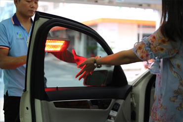 10、收工之后,邀请客户进行1000瓦烤灯实车体验每块玻璃膜高强度防晒效果。